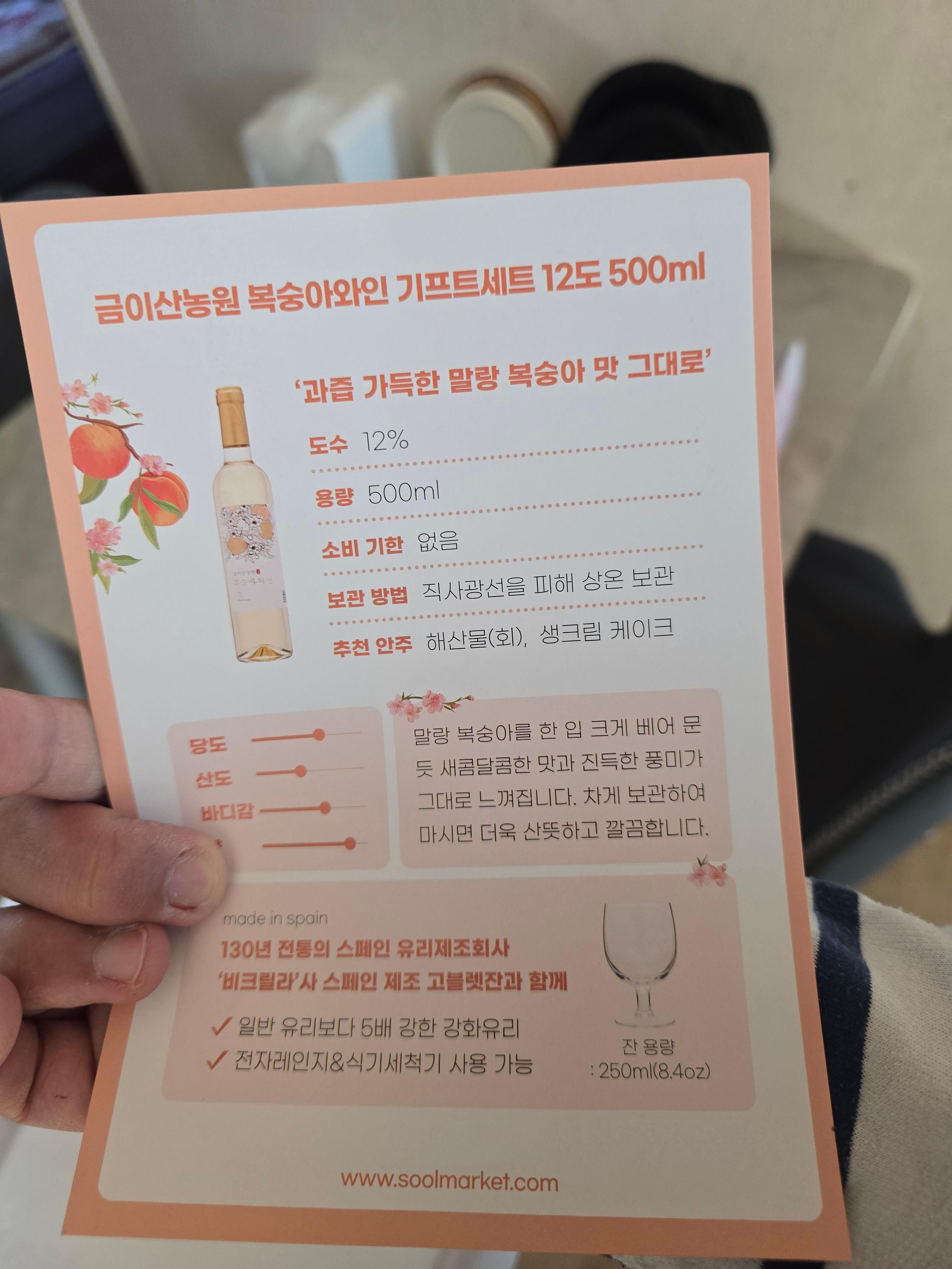 나중에 마시는데 복숭아의 달달한 향이 나서 좋았으나 맛과 도수가 나와 맞지 않아서 고민했는데 조개 술찜같은 해물요리도 생각났지만, 수육같은 고기 요리할 때 써도 될 것 같았다.